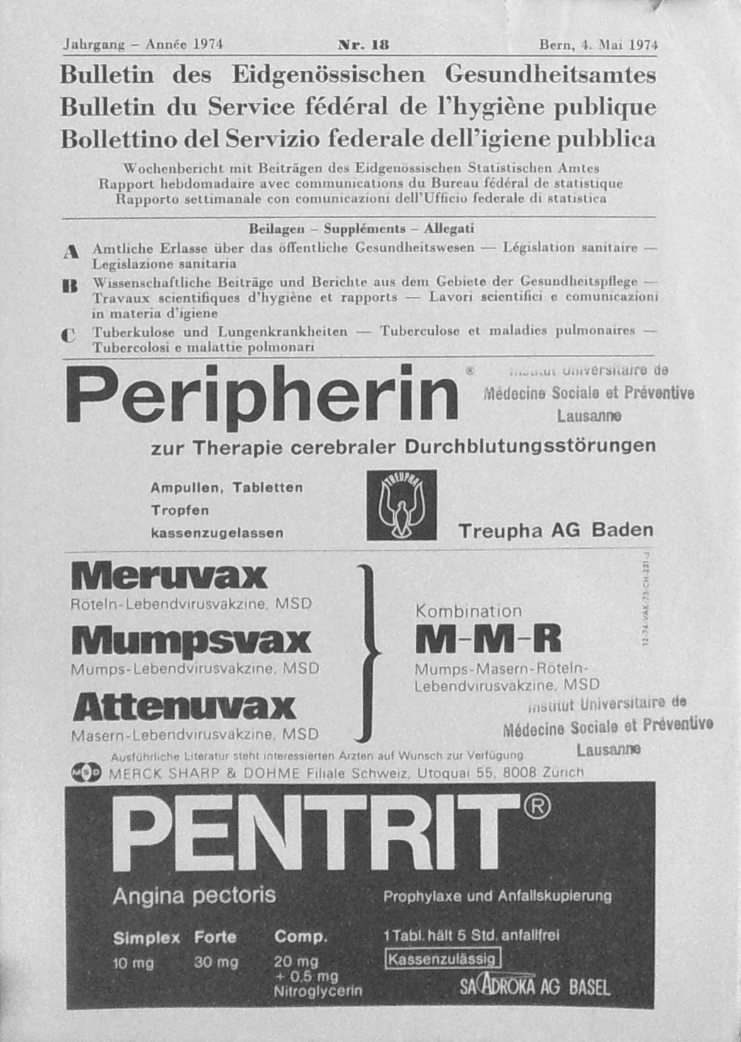 Dès les années 70, des publicités pour les vaccins paraissent dans les bulletins officiels de l'OFHP. Par exemple, une publicité de Merck Sharp & Dohme (MSD) pour le tout premier vaccin ROR, appelé MMR® (combiné Meruvax®: rubella-rubéole, Mumpsvax®: mumps-oreillons, Attenuvax®: measles-rougeole) figure dans plusieurs éditions de 1974. Le premier vaccin vivant atténue contre la rougeole est arrivé en Suisse en 1968: Attenuvax®.